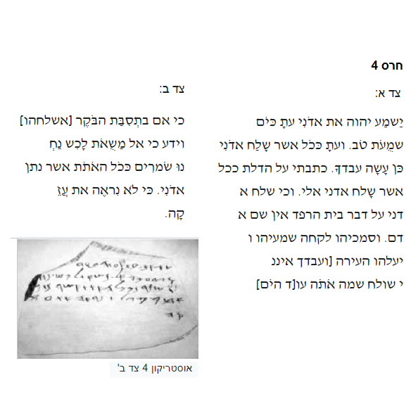 אוסטרקון (חרס רשום בדיו) בעברית. תל לכיש. מכונה "אוסטרקון מספר 4 צד ב'" ("וידע אדני כי אל משאת לכש נחנו שמרם ככל האתת אשר נתן אדני. כי לא נראה את עזקה"). תל לכיש. תקופת הברזל (מאה 6 לפנה"ס)