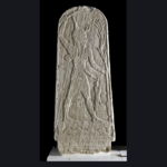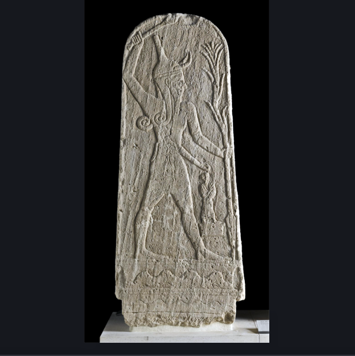 אסטלת האל בעל, אל הסערה, מחזיק באלה מונפת בידו האחת ומחזיק בידו השניה חנית. הדמת הקטנה מתחת לידו הינה כנראה של מלך אוגרית.אבן (Stone) גיר. האקרופוליס של אוגרית (ראס אל שמרה, סוריה, לחוף הים התיכון). המאות ה-15-13 לפנה”ס. תקופת הברונזה (Bronze) המאוחרת