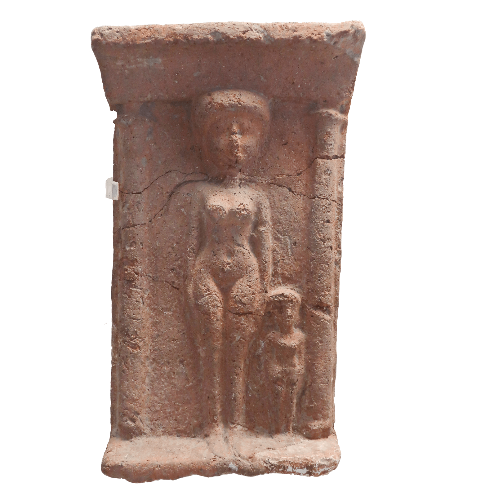 אשה וילד עומדים בין 2 עמודים בחזית מקדש. דגם (Model) החזית (מחרס) נוצק באמצעות תבנית (Mould). תקופת הברזל 1