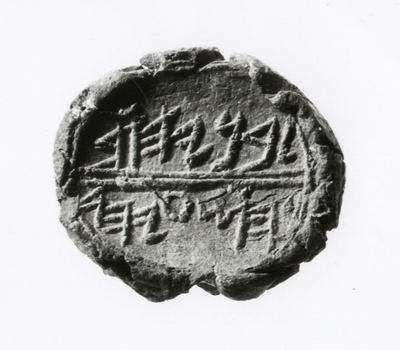 בולה (טביעת חותם) ממטמון 45 בולות שהתגלה בשטח G ב"בית הבולות" בעופל (עיר דוד) נושא כתובת: לבניהו בן הושעיהו". תקופת הברזל 2