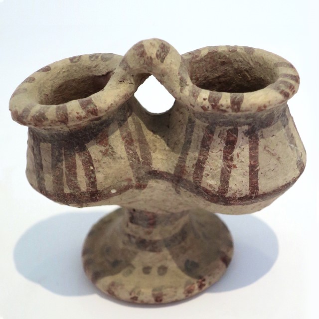 2 גביעים קטנים מחוברים בידית על גבי רגל משותפת, עם עיטור בקווים חומים על רקע בהיר בסגנון "שוקולד על לבן" (אך ללא חיפוי לבן מבריק). תקופת הברונזה המאוחרת