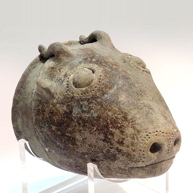 גביע זואומורפי, בצורת ראש בעל חיים (פר), מעוטר בטכניקת תל-אל-יהודיה, תקופת הברונזה התיכונה 2