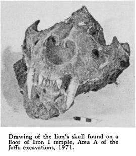 גולגולת של אריה שהתגלתה במקדש בתל יפו (חפירות י. קפלן). תקופת הברזל 1