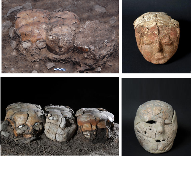 התמונות משמאל (עליונה ותחתונה): 3 גולגלות מכויירות בגבס מיפתחאל. התמונה העליונה למעלה: גולגולת מכפר החורש (ליד נצרת). התמונה התחתונה מימין: גולגולת מכויירת מעמק החולה (אתר בייסמון Beisamoun, Besamon)