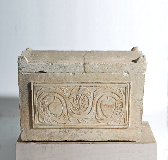 גלוסקמא מעוטרת בעלים וברימון. בקצות המכסה 4 "קרנות מזבח". אמצע המאה הראשונה או מאוחר יותר (המאה השניה).התקופה הרומית.