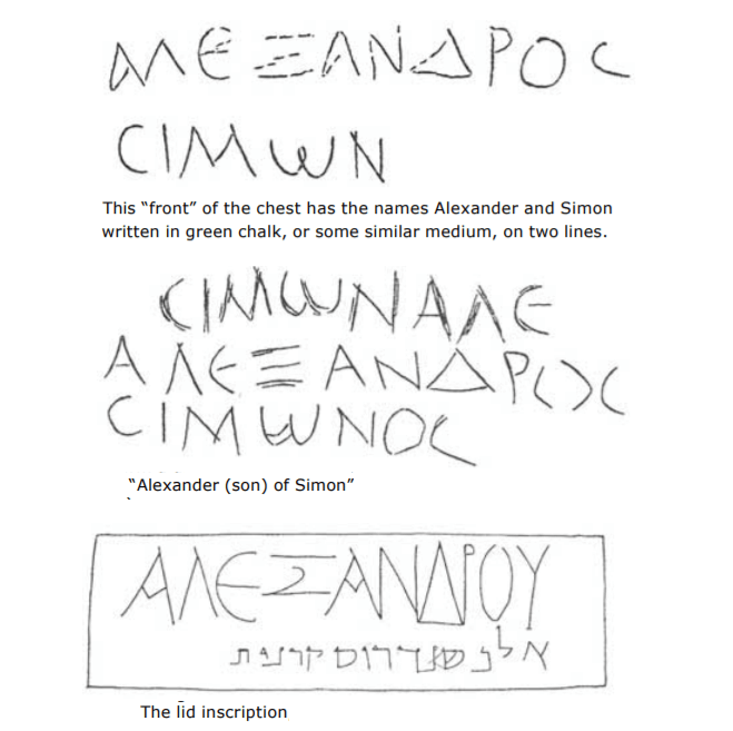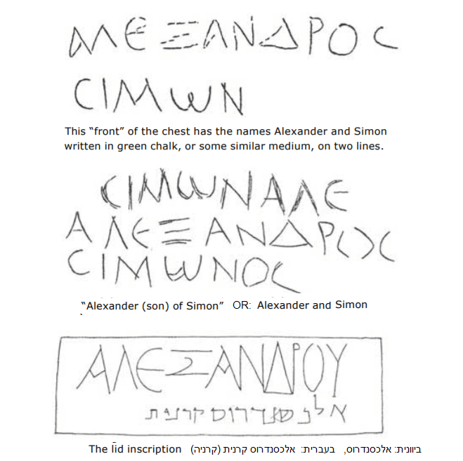 גלוסקמה עליה כתובות ביוונית "אלכסנדרוס" "סימונוס" (אלכסנדר בן סימון או אלכסנדר וסימון), וגם כתובת בעברית: "אלכסנדרוס קרנית" (אלכסנדרוס מCyrene, לוב).