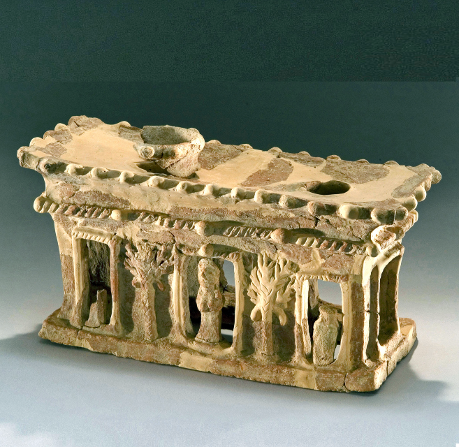 דגם בניין עם 2 עצים בחזית ודמות במפתח (Key) המרכזי. פלישתי. מקדש יבנה (הפביסטה). תקופת הברזל 1