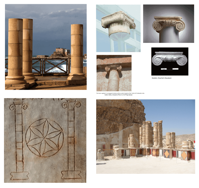 אחד המאפיינים הבולטים בעיטורי הגלוסקמא הוא שהעמודים מורכבים ממספר חוליות. עמודים מקטעיים כאלה אופייניים לאדריכלות המונומנטלית ההרודיאנית בקיסריה, במצדה ובהרודיון - אתרי בנייה מרכזיים של המלך הורדוס, אשר שיקם ובנה מחדש גם את בית המקדש בירושלים.