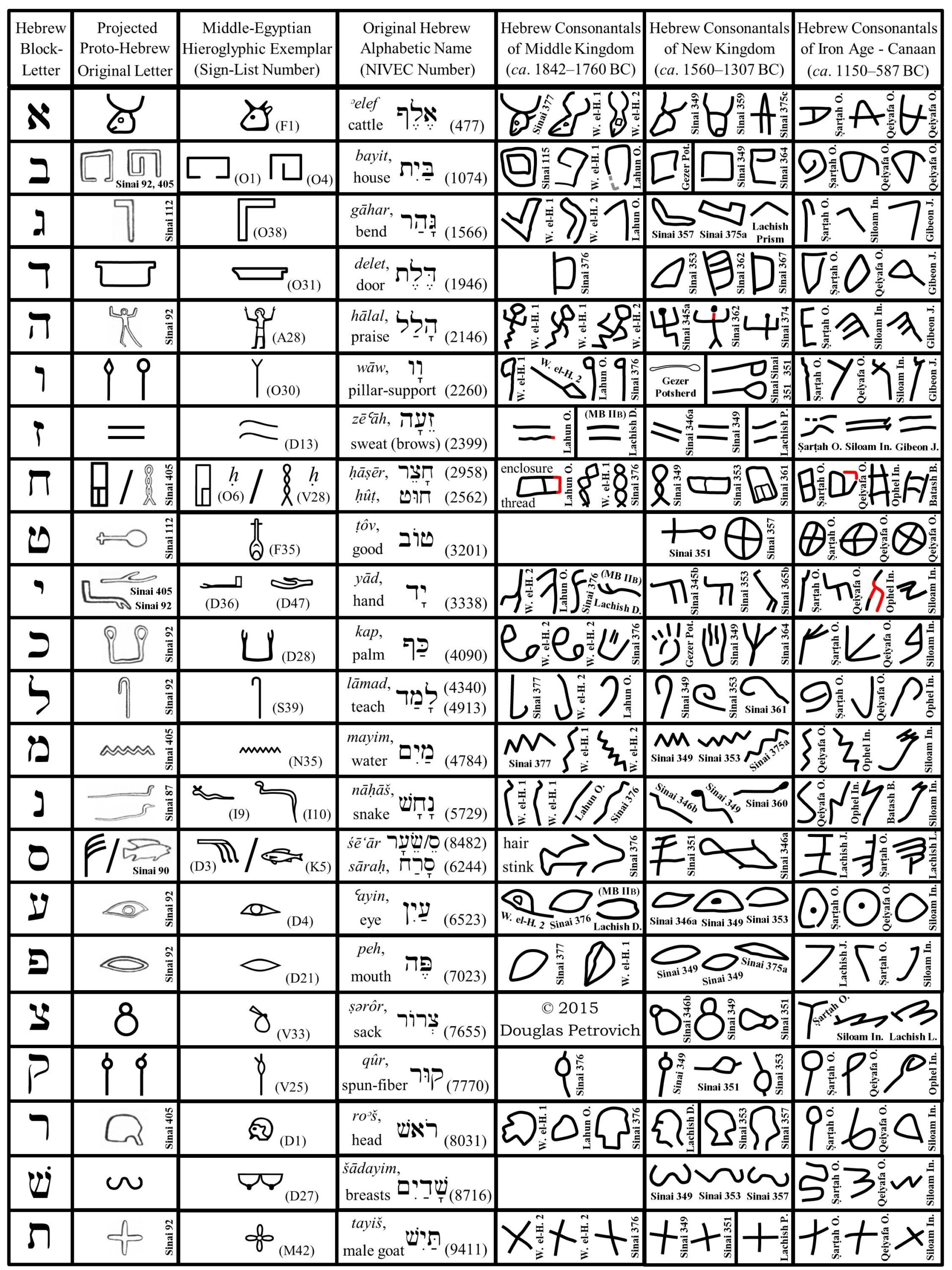 הכתב (האותיות) הפרוטו-כנעני על-פי כתובות שונות. החל מהמאה ה-17 לפנה”ס ועד שלהי תקופת הברונזה המאוחרת.