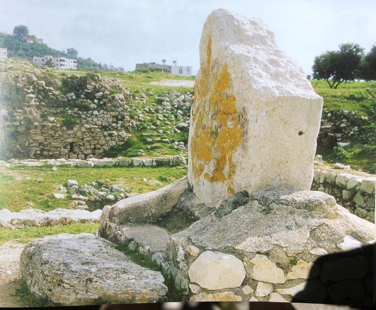 המצבה הלבנה הגדולה שהתגלתה בתל בלאטה (שכם הקדומה) בסמוך לחומה. אפשר ומדובר במצבה ששימשה השראה לסיפור הברית שכרת יהושע בן נון והעם בשכם (יהושע פרק כ”ד, כ”ה).