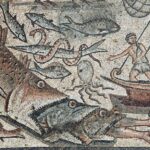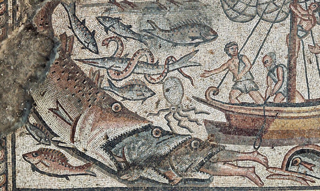 השלכת יונה הנביא לים ובניית מגדל בבל. קטע מרצפת בית הכנסת בחוקוק (צפון מזרח הכנרת). התקופה הביזנטית