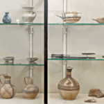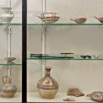 מוזיאון רוקפלר: ויטרינת כלים דו גונים (ביכרומו) ואחרים מתל אל עג’ול (רצועת עזה) במוזיאון רוקפלר. שלהי תקופת הברונזה (Bronze) התיכונה – תחילת תקופת הברונזה (Bronze) המאוחרת