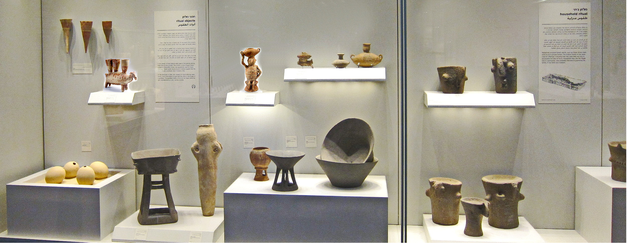 מוזיאון ישראל: ויטרינת כלים פולחניים מגילת (צפון הנגב, ליד אופקים), מנחל באר שבע, ממקדש עין גדי, ממערת קבורה באזור (ליד חולון), מגבעת האורנים (מזרחית לשוהם). מימין: מכתשי בזלת מעוטרים בראשי אדם מרמת הגולן. התקופה הכלקוליתית