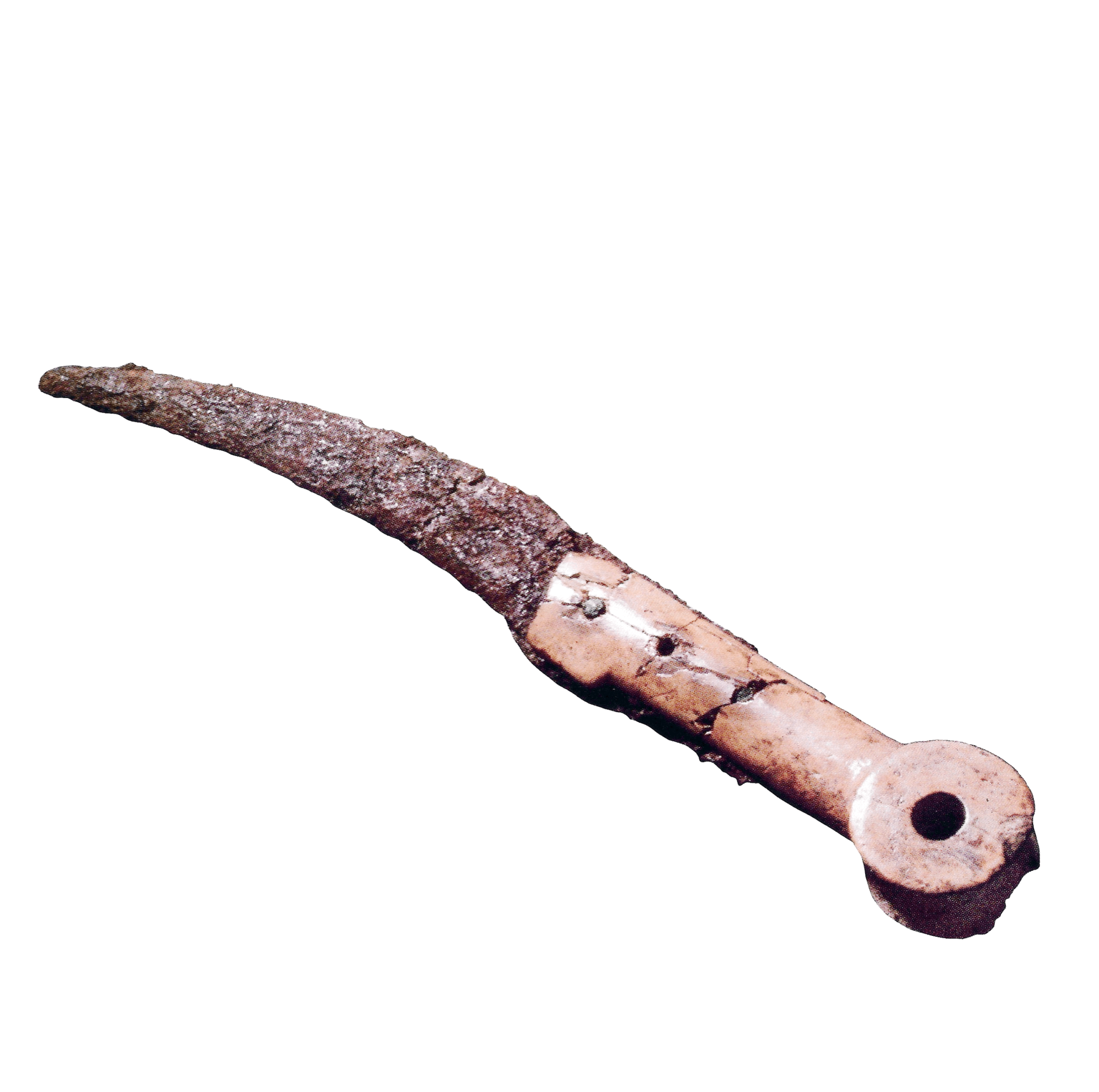 חרב ברזל עם ידית (Handle) מעצם (או משנהב). תל מקנה (עקרון העתיקה, מערי הפלישתים). המאה ה-12 לפנה"ס. תקופת הברזל 1