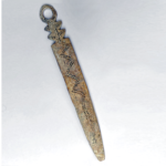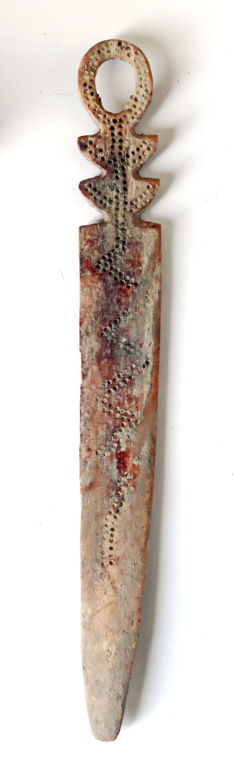 חפץ מעוטר דמוי “חרב” עם לולאת תלייה. עשוי משנהב. מעוטר בנקודות (כ-28.5 ס”מ). התקופה הכלקוליתית המאוחרת