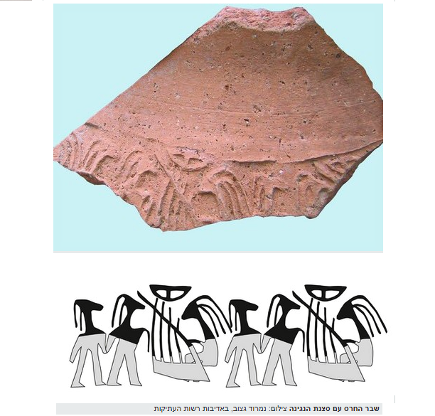 טביעת חותם גליל על שבר קנקן מבית העמק עם מנגנים בנבל. תקופת הברונזה הקדומה ג' (מתוך מאמר של אמנון בן-תור)