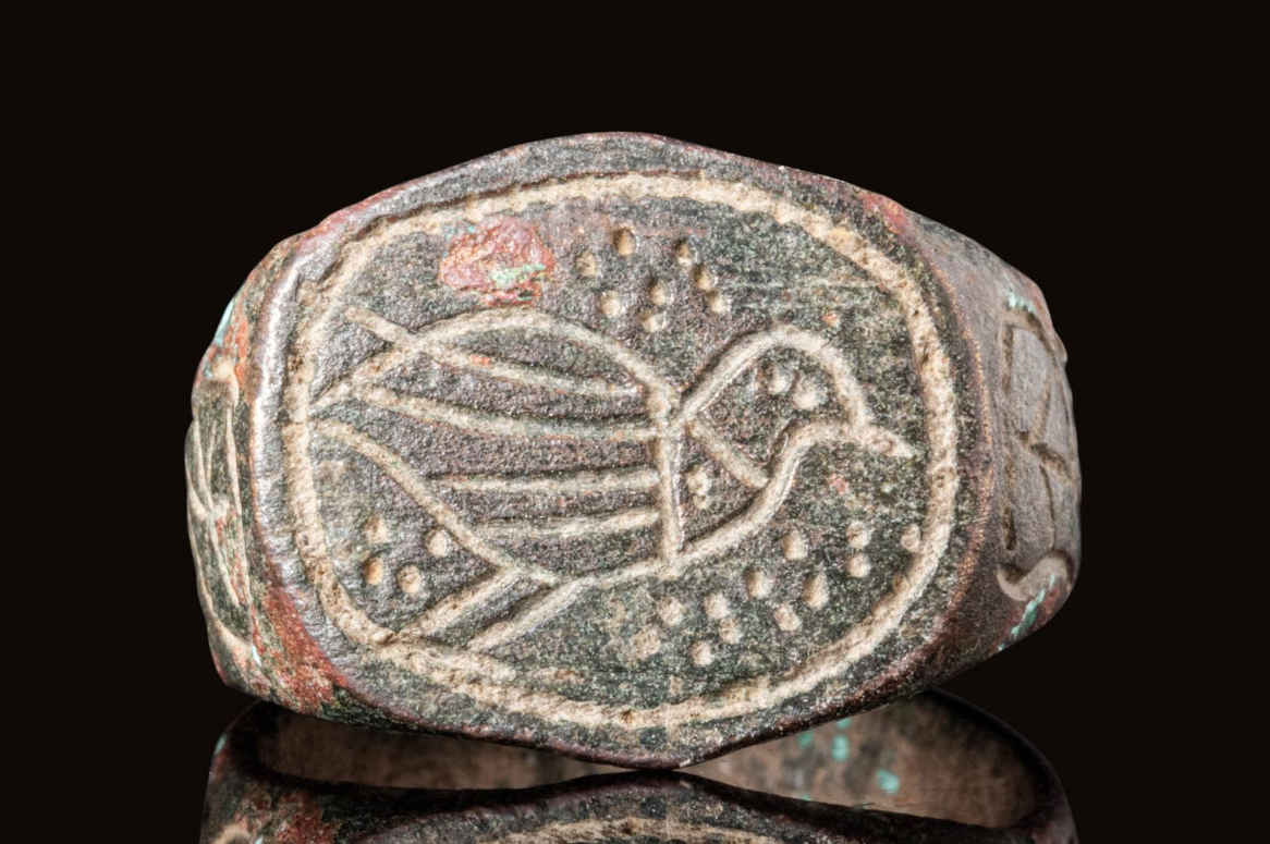 טבעת אצבע מעוטרת ביונה. היונה סימלה בקרב הנוצרים את אלהים (אלהים נגלה לראשונה לישו בצורת יונה). התקופה הביזנטית