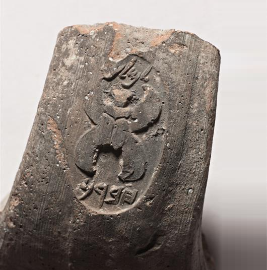 ידית קנקן עם 4 ידיות מטיפוס "למלך" מוחתמת בחותם "למלך חברן" 4 כנפי. תל לכיש. תקופת הברזל 2