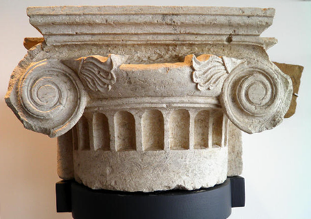 כותרת אבן מהודרת של עמוד שיש מהעיר הקדומה פלה Pella (פחל) כ-5 ק”מ מבקעת הירדן, בעבר הירדן. סגנון הכותרת דומה לזו של כותרת שהתגלתה בעיר העליונה בירושלים (באזור המגורים המהודר של העיר). התקופה הרומית הקדומה.