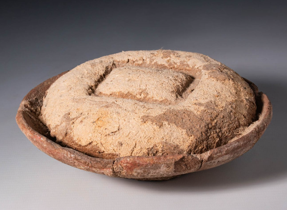 כיכר לחם בצלחת חרס שהשתמר בשלמותו במצרים.