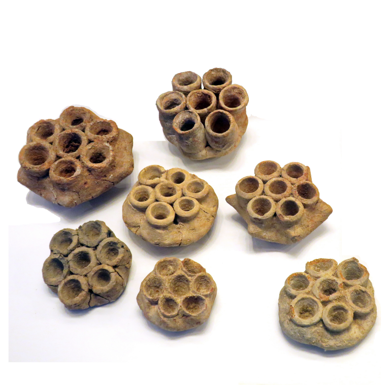 כלים פולחניים קטנים עגולים, עם 7 מכלים כל-אחד (6 מסביב למיכל במרכז), מקדש נהריה, תקופת הברונזה התיכונה 2