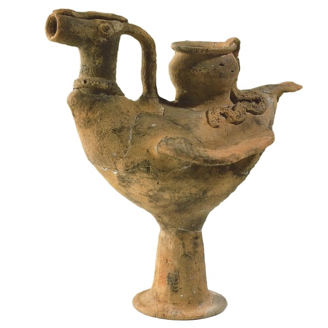 כלי זואומורפי, ציפור עם נחשים על רגל, חפירות יריחו, תקופת הברונזה התיכונה 2 (המוזיאון הארכיאולוגי רבת עמון)