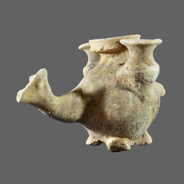 כלי מזיגה זואומורפי, כנראה גמל כורע, עם 2 כדים ופתח מזיגה מסוגנן. תקופת הברזל (או הלניסטי-רומי)