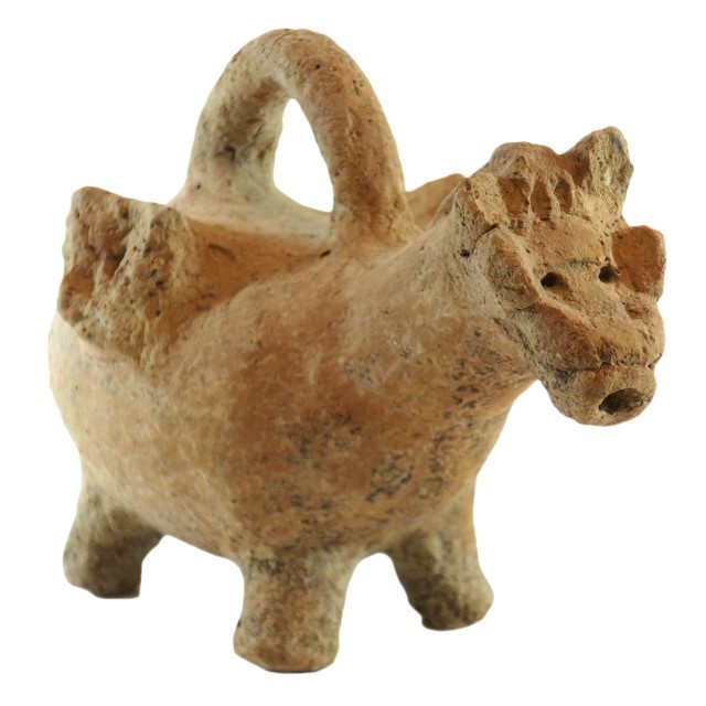 כלי מזיגה זואומורפי, עם רתמה, עם ידית סל, עם 2 כדים (שבורים) לצידיו, תקופת הברזל