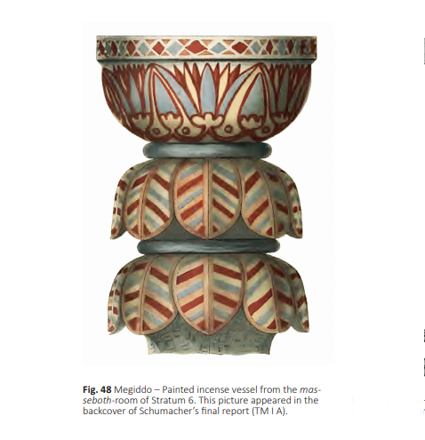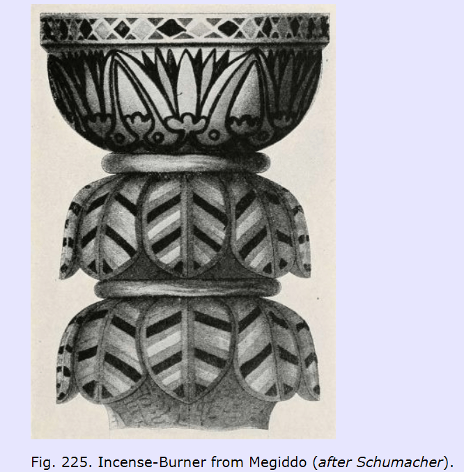 כלי פולחני (כן פולחני) ובו המוטיב של “כפתור ופרח”. מתוך פרסום חפירות מגידו (שומאכר 1903). המקור אבד. תקופת הברזל 2