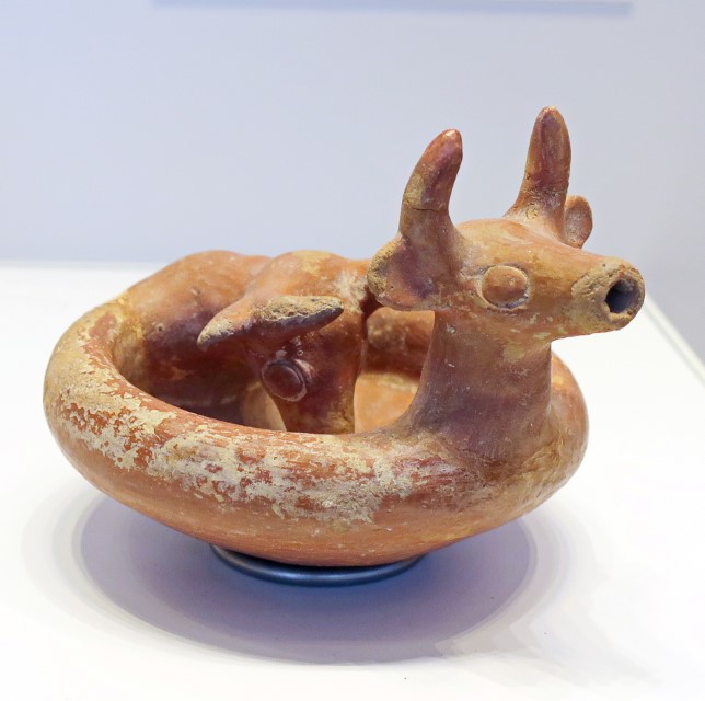 כלי פעלול, עם 2 שוורים – האחד בטבעת והשני “שותה” מהכלי (בתוכו). תקופת הברזל 1