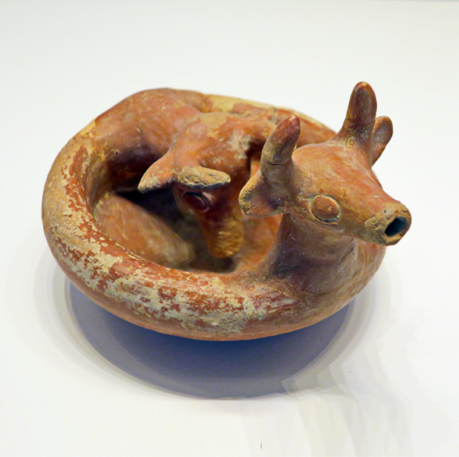כלי פעלול, עם 2 שוורים - האחד בטבעת והשני "שותה" מהכלי (בתוכו). תקופת הברזל 1