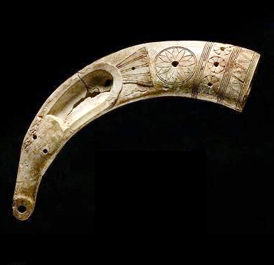 כלי קוסמטיקה מעוטר משנהב, דמוי ברווז (הראש והמכסה חסרים). חלק ממטמון השנהבים הגדול שנמצא במגידו. 1200-1300 לפנה"ס. תקופת הברונזה המאוחרת