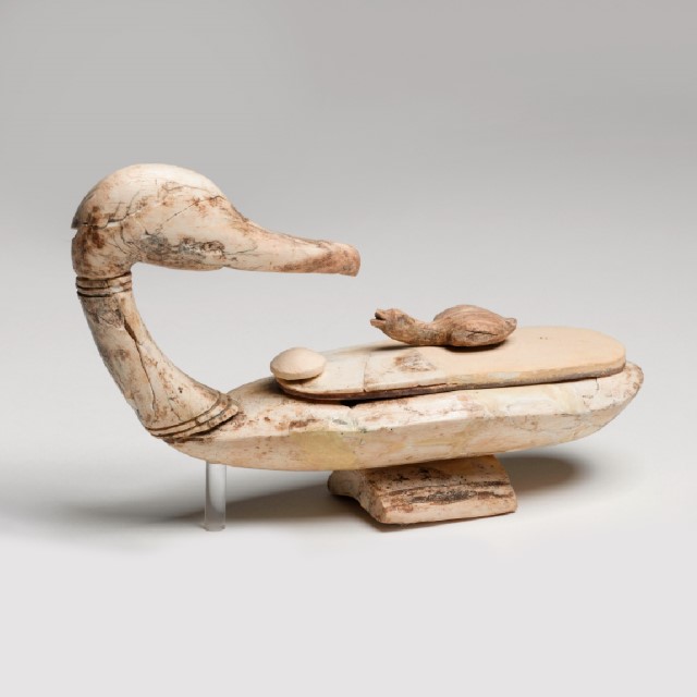 כלי תמרוקים (קוסמטיקה), עם ראש ברווז וברווזון על המכסה, עכו, תקופת הברונזה המאוחרת ממצאים דומים נתגלו בלבנון.