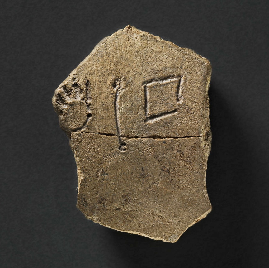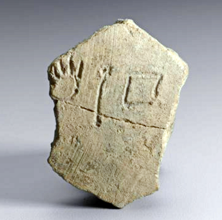 כתובת פרוטו כנענית (משמאל לימין) בת 3 אותיות: “כלב”. תל גזר. תקופת הברזל 1