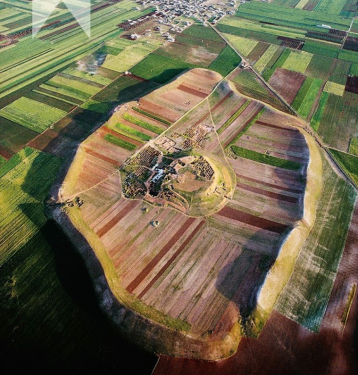 בצילום השני: מראה מהאוויר של תל אבלה ובמרכזו ה"אקרופוליס".