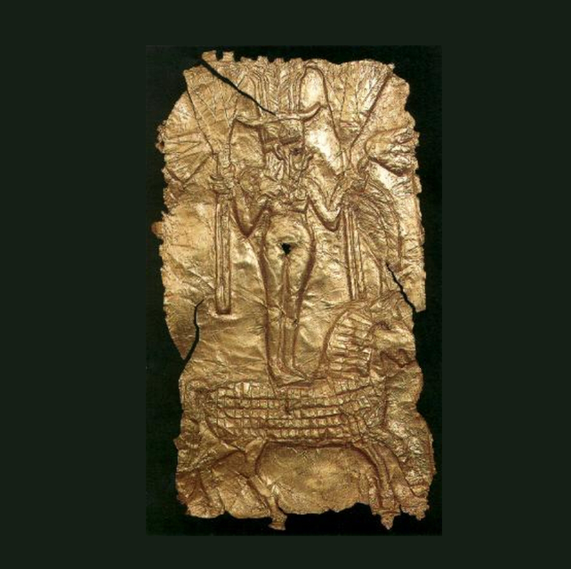 לוחית זהב מעוטרת בריקוע המתאר דמות של אלה העומדת על גבי סוס ומחזיקה ב-2 ידיה ב-2 פרחי לוטוס. לכיש. תקופת הברונזה המאוחרת