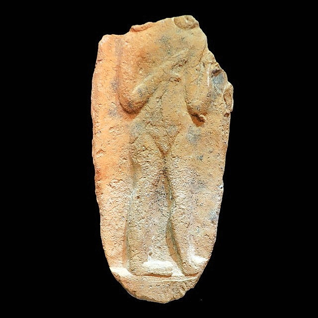 לוחית צלמית (Figurine) אלה בתנוחת צעידה. לאלה תסרוקת האלה חתחור (מרבית הראש שבור). 2 ידי האלה מופנות הצידה “בתנועה”. ככל הידוע מתל לכיש. תקופת הברונזה (Bronze) המאוחרת.