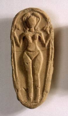 לוחית-צלמית. האלה חתחור מחזיקה בענפי לוטוס. תל בטש (לא רחוק מבית שמש). מאות 14-13 לפנה"ס. תקופת הברונזה המאוחרת.