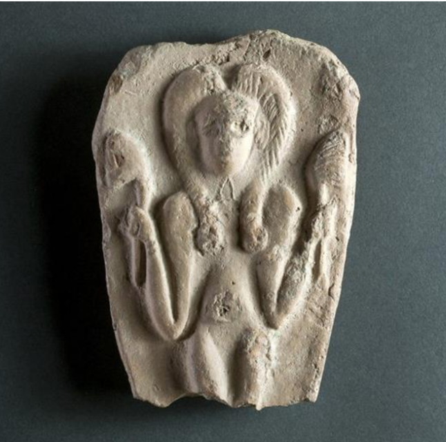 לוחית צלמית של אשה (או אלה) בתסרוקת האלה חתחור המחזיקה ב-2 ידיה ב-2 פרחי לוטוס. הצלמית שוברה במכוון בחלקה התחתון (כנראה בטקס פולחני). תל בית מרסים. תקופת הברונזה המאוחרת