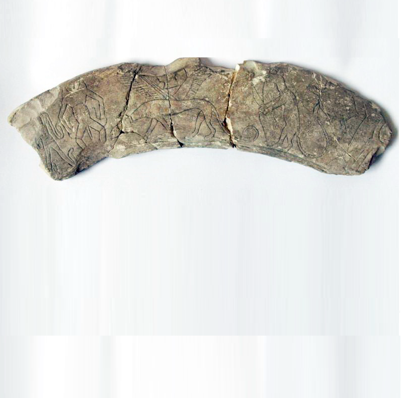 לוחית שנהב,עם סצינה. צב, חתול מחזיק בסכין, איילה (?) עם כנפיים, ודמויות מיתולוגיות (בס?). מגידו. תקופת הברונזה (Bronze) המאוחרת