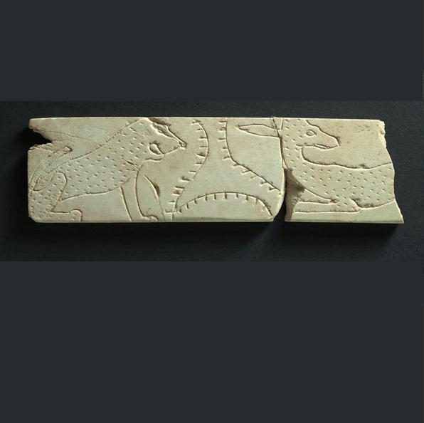 לוחית שנהב לשיבוץ (Inlay) בקופסא מעוטרת באריה וגדי. תל בית שאן. תקופת הברונזה (Bronze) המאוחרת