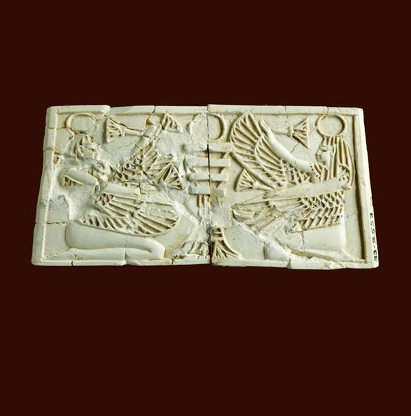 לוחית שנהב מעוטרת ב-2 דמויות אנשים כורעים ולהם כנפיים עם עיטורים מצריים נוספים, בסגנון פיניקי-מצרי שהיה נפוץ בלבנון ובסוריה במאה התשיעית לפני הספירה. נמצאה במבנה המיוחס לארמון אחאב בשומרון (סבסטיה) יחד עם לוחיות שנהב נוספות רבות. המאה התשיעית לפנה”ס. תקופת הברזל 2
