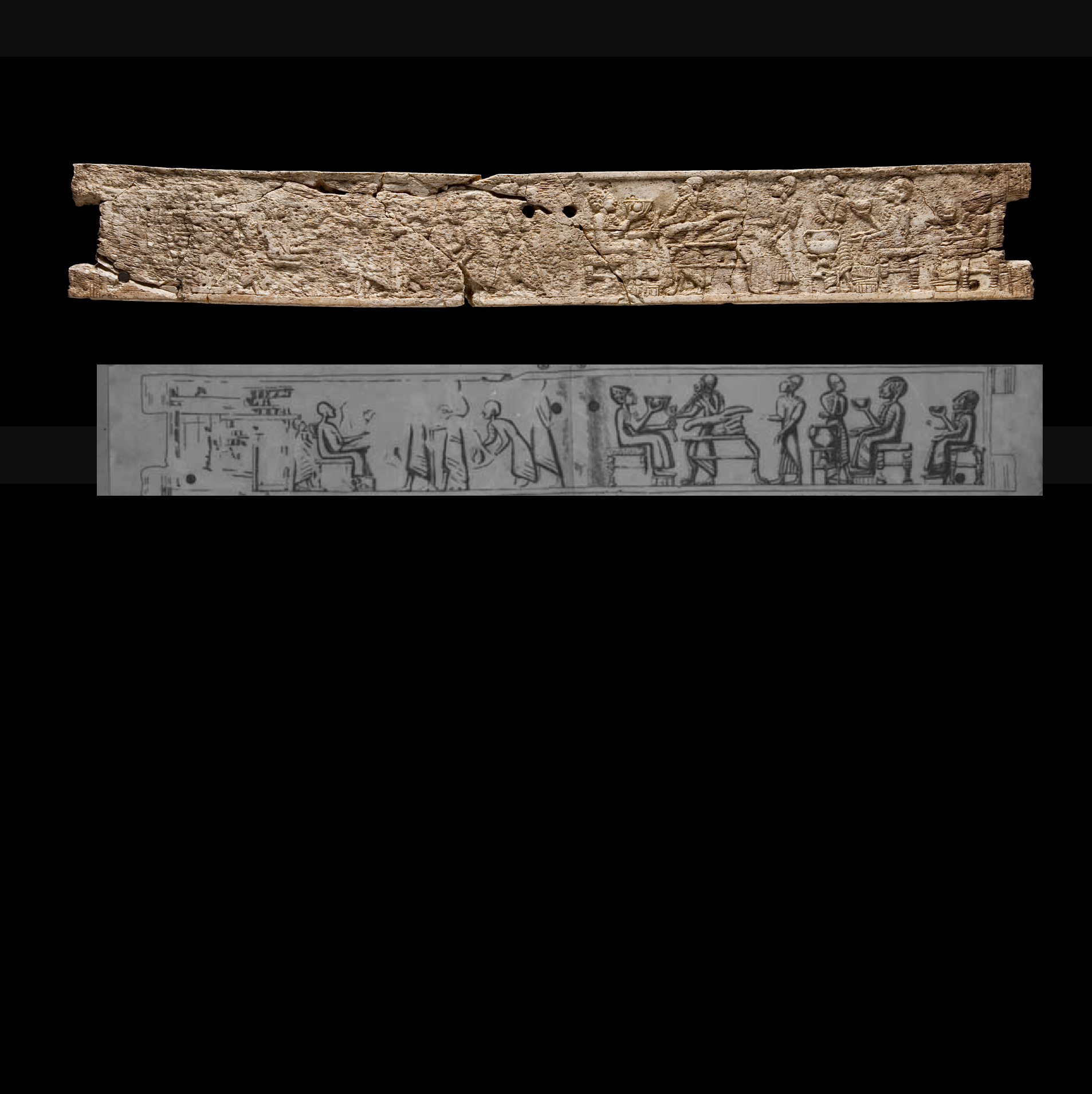 לוחית שנהב עם סצינה של משתה. שנהב. כ-40 ס”מ אורך. תל מגידו. תקופת הברונזה (Bronze) המאוחרת (1400-1200 לפנה”ס).