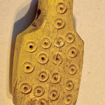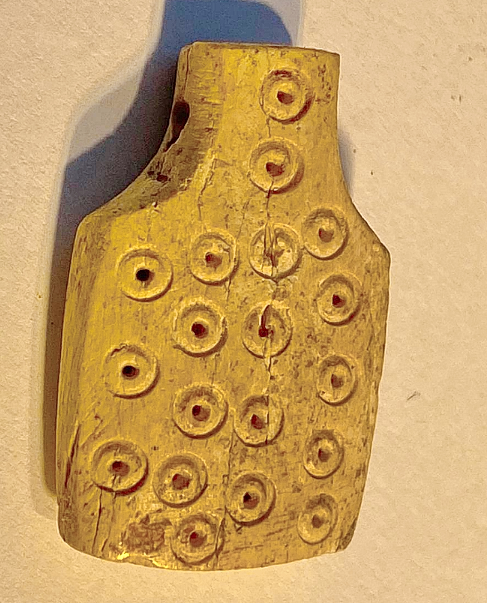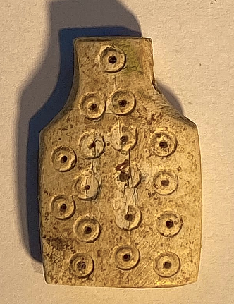 לוחית שנהב קטנה שהוכנה כתליון עליה עיגולים משני הצדדים. מזכירה בצורתה לוחות שנה משנהב. תקופת הברזל 2