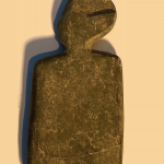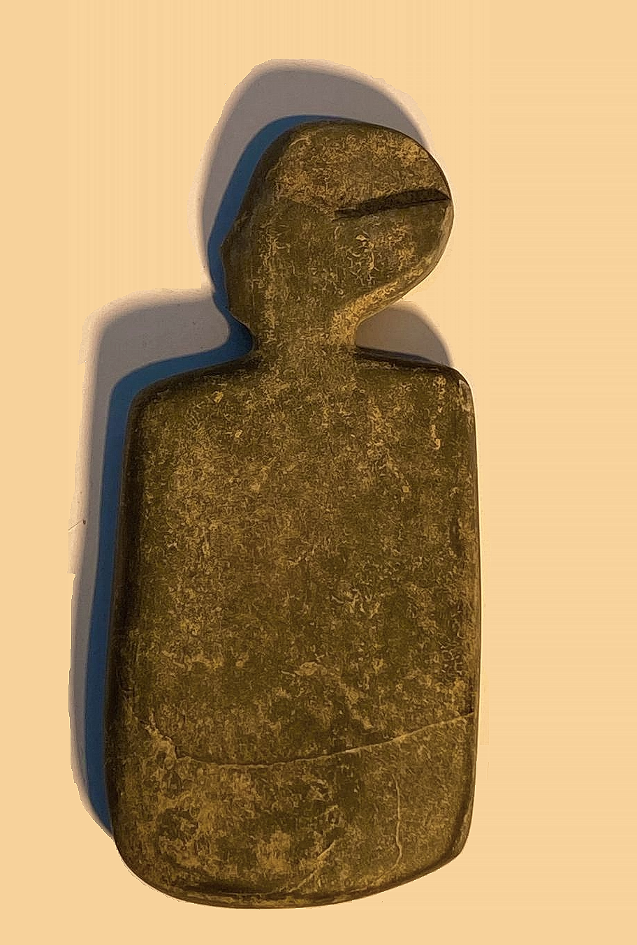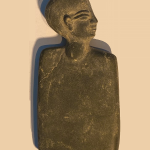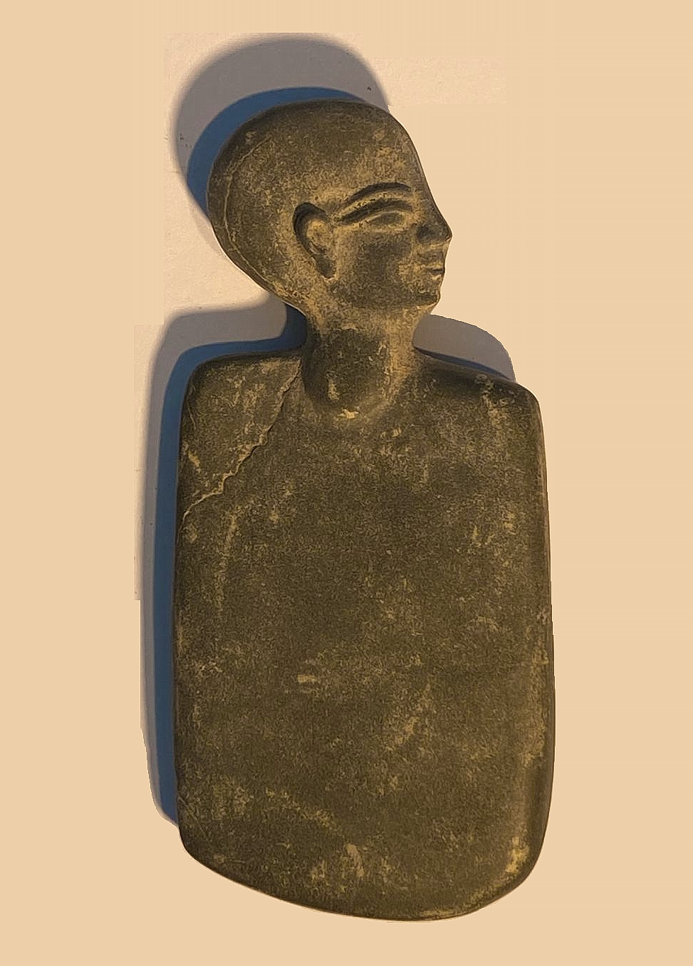 לוחית תמרוקים ירוקה-שחורה מאבן שיסט מעוטרת בפני אדם קרח (או עם פאה). תקופת הברונזה המאוחרת
