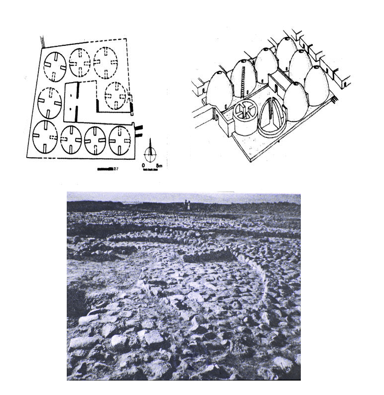 צילום מזמן החפירות ושחזור מבנה המעגלים המיוחס לבית אסמים גדול שכלל במקור 9 אסמים מעגליים מחפירות בית ירח (תל כרך). תקופת הברונזה המאוחרת ג