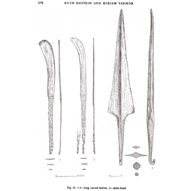 לגרזנים הכבדים נמצאו מספר מקבילות בארץ, שהתגלו בבית שאן, פלמחים, יפתחאל, קרית אתא, תל ערני ונחל אלכסנדר - וניתן להניח שכולם נוצקו בארץ. נראה שכל כלי הנשק מנחושת בקבוצת המטמון (גרזנים, ראשי רומח, פגיונות, ראש אלה) נוצקו בארץ ישראל (כנען), בה התגוררה בתקופת הברונזה הקדומה א2 גם אוכלוסייה מצרית, בעיקר לאורך מישור החוף (ראה למשל ממצאים מצריים שהתגלו באזור, ליד אזור התעשייה בחולון, מתקופת הברונזה הקדומה א2). משכך אפשר להעלות סברה כי המטמון היה ברשות אדם/אנשים שנמנו על האוכלוסייה המצרית בארץ ואשר שמרה על קשרים עם מצרים, וכי הוא הוטמן על ידי בעליו בקרקע על מנת להסתירו מסיבה כלשהי, מתוך תקווה לאסוף אותו מאוחר יותר, אך הדבר לא יצא אל הפועל.