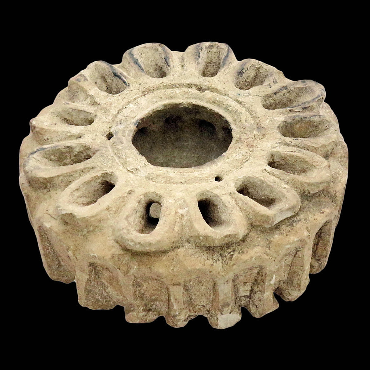 מנורת אבן עגולה, בצורת בניין, יתכן ומדמה את בסיס מסגד כיפת הסלע (“כיפת הזהב”), שנבנתה בסביבות שנת 700 לספירה ע”י עבד-אל-מלכ