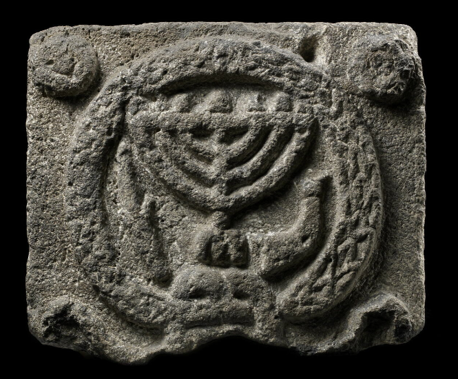 מנורת שבעת הקנים שופר ולולב (?), מגולפים באבן (Stone) בזלת. מביהכנ"ס של Um Qeis (אום קיס = גדרה) בצפון עבר הירדן. המאות הרביעית-חמישית לספירה. התקופה הביזנטית