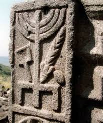מנורת 7 הקנים, עם לולב, אתרוג ומחתה. מביהכנ"ס באום אל קאנטיר (רמת הגולן). התקופה הביזנטית